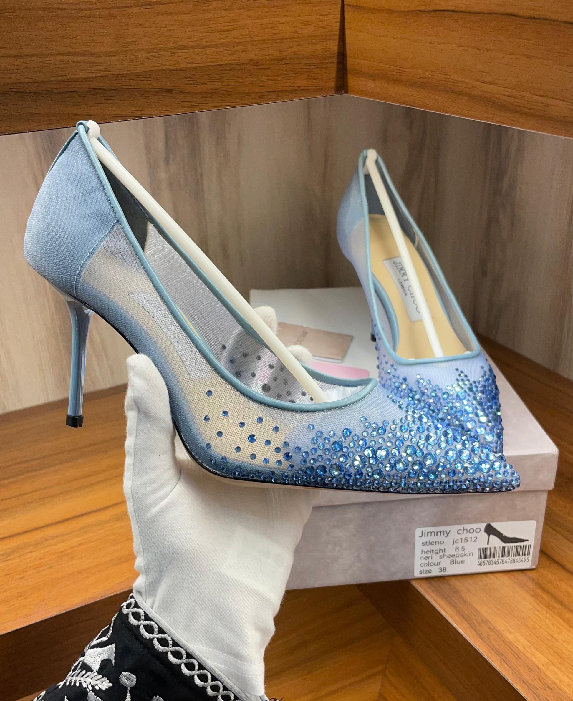 Experience elegance and sophistication with our Jimmy Choo High Heels in Blue. Crafted with expert attention to detail, these heels feature a sleek, timeless design that will elevate any outfit. Made with high quality materials, these heels provide both comfort and style, making them a must-have in any shoe collection.